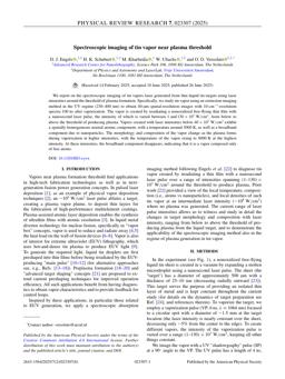 We report on the spectroscopic imaging of tin vapors laser generated from thin liquid tin targets using laser intensities around the threshold of plasma formation. Specifically, we study tin vapor using an extinction imaging method in the UV regime (230–400 nm) to obtain 40−µm spatial-resolution images with 10−cm−1-resolution spectra 100ns after vaporization. The vapor is created by irradiating a nonoxidized free-flying thin film with a nanosecond laser pulse, the intensity of which is varied between 1 and 130×10^7 W/cm2, from below to above the threshold of producing plasma. Vapors created with laser intensities below 40×10^7 W/cm2 exhibit a spatially homogeneous neutral atomic component, with a temperature around 3000 K, as well as a broadband component due to nanoparticles. The morphology and composition of the vapor change as the plasma forms during vaporization at higher intensities, with the temperature of the vapor rising to 8000 K at the highest intensity. At these intensities, the broadband component disappears, indicating that it is a vapor composed only of free atoms.